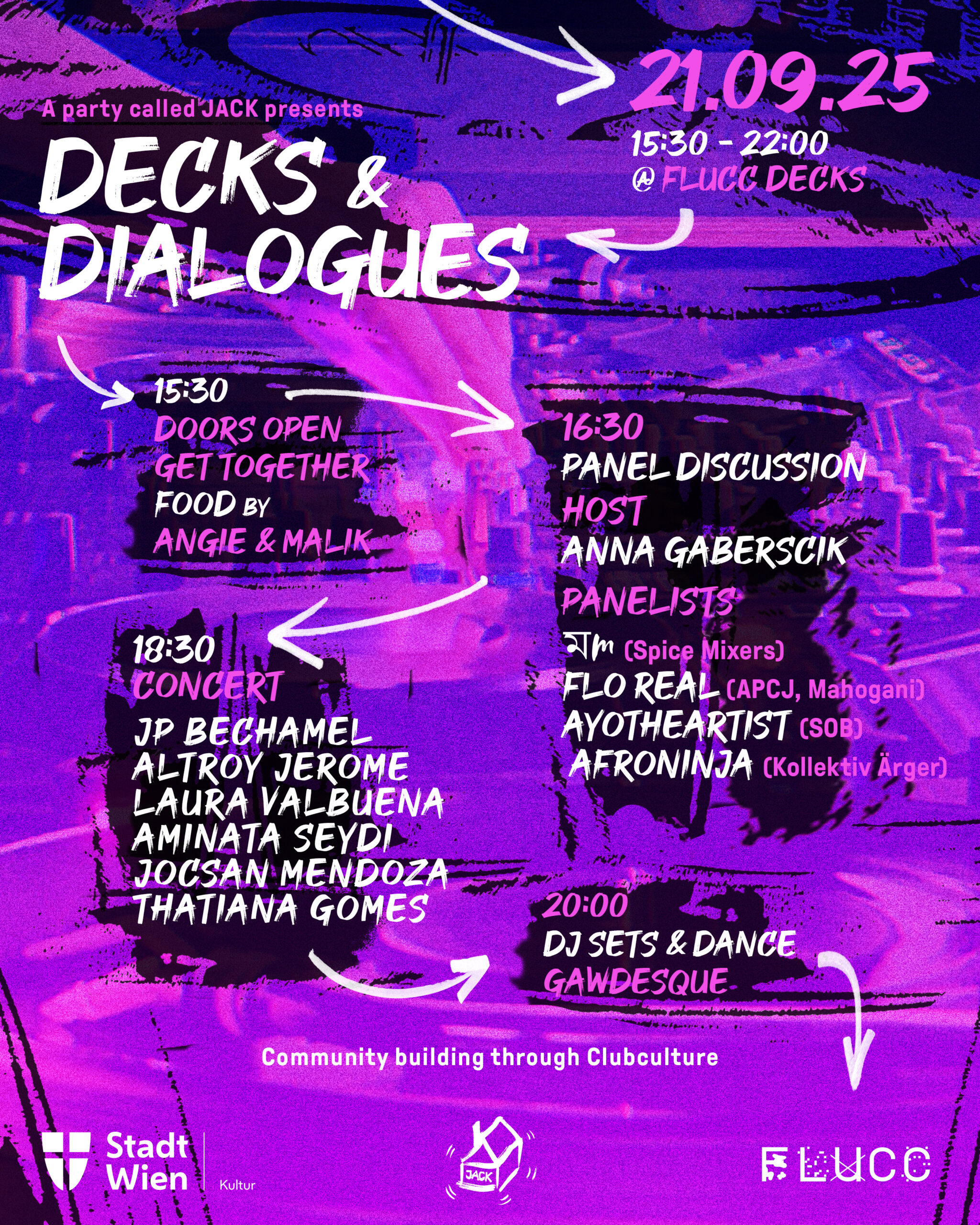 30 OCT: KOKOROKO SUPPORT @ FLEX, VIENNA / AT23 OCT: OUR SOCIETY @ PHONO LAKE , AMSTERDAM / NL 11 OCT: LOVEDANCIN’ @ CLUB OST, BERLIN / DE2 OCT: KIDS OF THE DASPORA @ KUNSTHALLE WIEN21 SEP 25 DECKS & DIALOGUES @ FLUCC VIENNA/AT4 SEP 25: PIECES CHESS CLUB, VIENNA/AT31 AUG 25: JAZZ REFOUND FESTIVAL, CELLA MONTE/IT24 AUG 25: SHAPES FESTIVAL, ZAKYNTHOS/GR17 AUG 25: WE OUT HERE FESTIVAL, DORSET/UK10 AUG 25: NTS RADIO, LONDON/UK9 AUG 25: JUMBI, LONDON/UK1 AUG 25: PARADIES GARTEN FESTIVAL, BRUCK A.D. LEITHA/AT19 JUL 25: IMPULSTANZ FESTIVAL, VIENNA/AT18 JUL 25: BELVEDERE 21, VIENNA/AT4 JUL 25: PRST, VIENNA/AT3 JUL 25: TEATRO PEREYRA, IBIZA/ES28 JUN 25: FLUCC, VIENNA/AT20 JUN 25: SPRINGFESTIVAL, GRAZ/AT13 JUN 25: DETROIT LOVE, BARCELONA/ES6 JUN 25: FANIALIVE, VIENNA/AT31 MAY 25: LIGHTHOUSE FESTIVAL, POREC/HR3 MAY 25: ENTEKA, ATHENS/GR18 APR 25: SASS, VIENNA/AT22 MAR 25: FLUCC, VIENNA/AT8 MAR 25: HEIDEGLÜHEN, BERLIN/DE08 FEB 25: BAR CHARLIE, MUNICH/DE17 JAN 25: SASS, VIENNA/AT20 DEC 24: PANORAMABAR, BERLIN/DE14 DEC 24: RUBY LISSI HOTEL, VIENNA/AT6 DEC 24: BURGER DISCO CLUB, ATHENS/GR1 NOV 24: KASHEME STUDIO, ZURICH/CH31 OCT 24: KASHEME LIVINGROOM, ZURICH/CH14 SEP 24: FLUCC, VIENNA/AT13 SEP 24: SKATE LOVE, BARCELONA/ES17 AUG 24: WE OUT HERE FESTIVAL, DORSET/UK2 AUG 24 🏰 PARADIES GARTEN FESTIVAL, BRUCK A/D LEITHA/AT2 AUG 24: FM4 LA BOUM DE LUXE, VIENNA/AT30 JUN 24: SOLARIS PLAYGROUND, VERBIER/CH28 JUN 24: BLITZ CLUB, MUNICH/DE 15 JUN 24: HEIDEGLUEHEN, BERLIN/DE1 JUN 24: POWERJAM ROLLER SKATE DISCO, VIENNA/AT22 MAY 24: MOTORCITY WINE, DETROIT/US